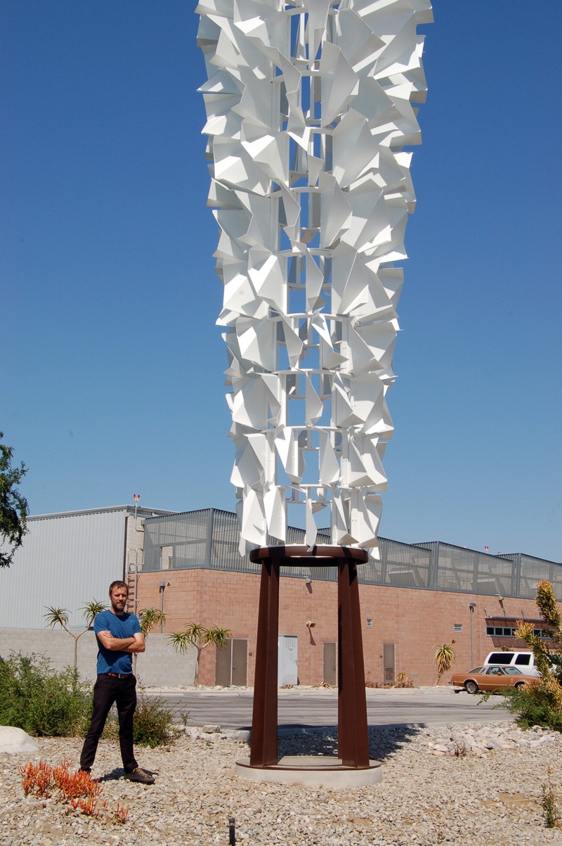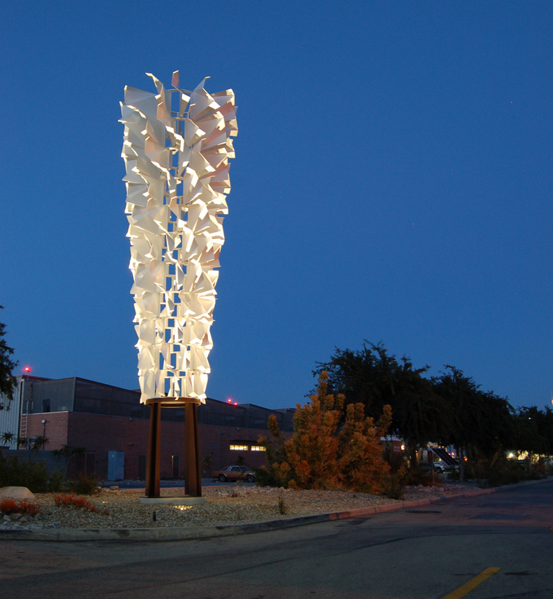 受洛杉矶文化局的委托,Matt Gagnon刚刚完成了为洛杉矶消防局设计的大型雕塑装置“Water Tower” (水塔)。该雕塑位于范奈斯机场消防站,一个32英尺高的白色雕塑给人留下了深刻的印象,仔细看去,这个雕塑的形式就像从消防水管里瞬间喷发出的水柱,强悍有力量,白色的折叠钢结构更加强化了力量的存在,但在白色钢板上反射的光线变化又会将其软化,更加贴近水的质量,设计师真的是良苦用心啊。但你可别以为这个雕塑只是观光用的,它之所以建那么高自然有它的用处,机场消防站的仓库是在一条小巷里,但这个位置确实整个洛杉矶地区的防火重地,驻守在现场的飞行员,医务人员和消防队员做着随时救援的准备,这个漂亮的白色高塔完全可以起到监测火灾的作用,可谓身兼重任啊!