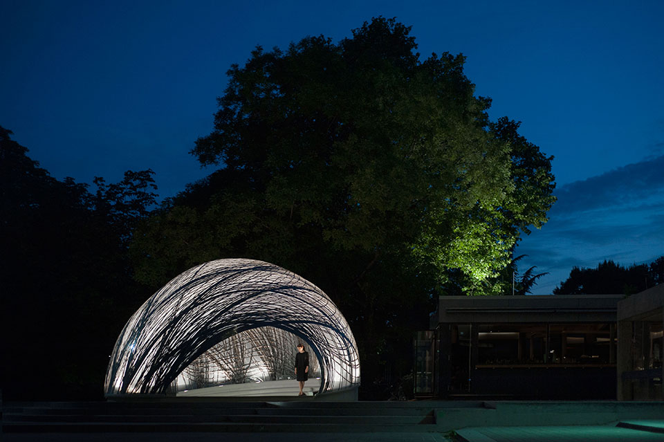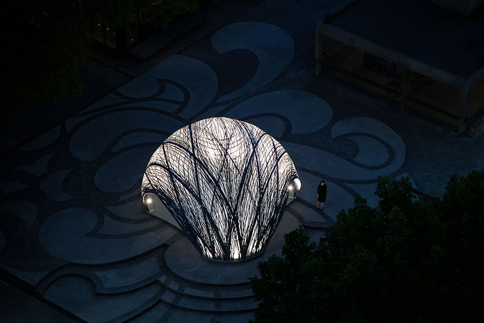 斯图加特Achim Menges教授在新作 ICD/ITKE亭中展示了一种全新的建筑,其灵感来自于生活在水下,并居住在水泡中的水蜘蛛的建巢方式。整个亭子是在一层柔软的薄膜内部用机器人织上可以增强结构的碳纤维而形成的轻型纤维复合材料外壳构筑物,同时这种建造方式使用到最少的材料实现了结构稳定性。该建筑原型的探索是斯图加特大学计算研究所设计(ICD)和建筑结构研究所(ITKE)在2014--2015年的研究成功,在计算机设计,仿真设计以及制造工艺领域有广泛的应用前景。