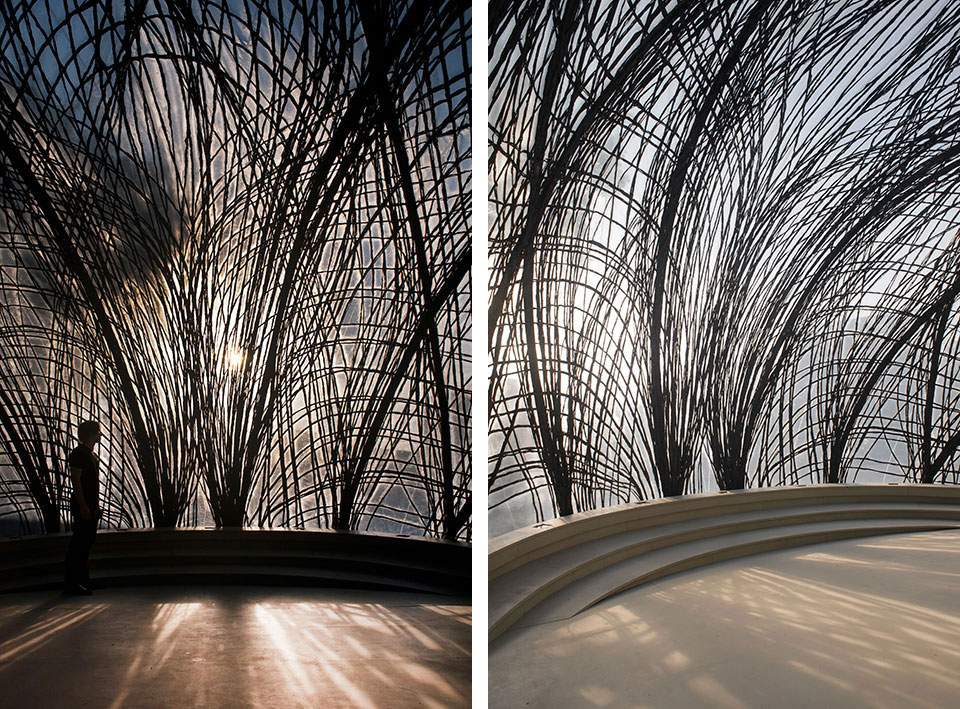 整个设计理念基于仿生学在纤维增强结构中的应用研究,这种应用不要求复杂的模板,也能适应不同结构的不同要求。研究团队研究了水蜘蛛的水下生活模式,它们在水下建造出钢筋般的坚固水泡并生活在其中,作为水泡支撑结构的蜘蛛丝能让水泡在遭遇水流变化时承受机械盈利,保证水泡内的安全和稳定。 实际建造时,亭子的轻薄薄膜现在机械产生的空气压力下成型,然后机械臂进入在薄膜内部植入碳纤维束,碳纤维变硬后就成为了牢固的结构。整个外壳的形状和碳纤维的位置方向都参考仿生学并经过了计算机的计算。最终成就了一个高性能节省材料的综合建筑皮肤。
