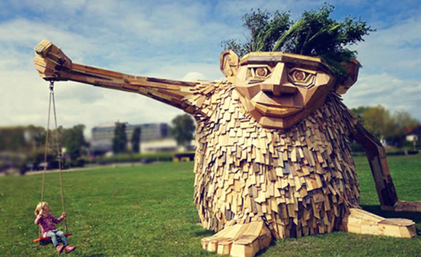 丹麦艺术家Thomas Dambo最近创作了一系列巨大的“天外来客”,举办了一个名为“Troels The Troll”(特勒尔斯巨魔)的循环雕塑展。他利用从废品处理场收集来的以及建筑剩余的废旧木材作为材料,在他异想天开的创造力下,完成了一系列巨大的神秘怪物雕塑,虽然“怪物”听起来怪吓人的,但实际上它们就像是《怪兽公司》里的怪物们一样,可是很有爱的,这些怪物雕塑们与周围的环境相融合,有的给小朋友架起秋千,有的坐在地上愁眉苦脸,还有的在啃食生长着的树枝,这样奇怪的举动却仿佛与现实世界没有任何不和谐的地方,让人们觉得它们好像就应该在这里,也正是这些怪物们的存在给城市又增添了很多乐趣和艺术性。
