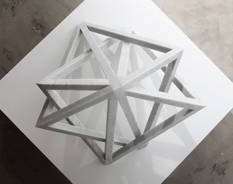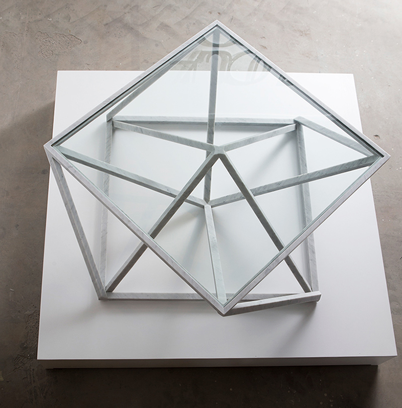 女艺术家Aljoud Lootah总部设在迪拜,是阿拉伯联合酋长国多学科的设计师,她的很多设计作品都获得了国际认可,其最新系列作品“The Double Square”是由蔓藤花纹图案演化而来的几何图案集合,带有阿拉伯风格的家具系列。它包括一个咖啡桌、凳子和一盏灯,由卡拉拉大理石制作而成,从顶部看过去,像是两个正方形旋转45度交错而成的几何图案,融合传统的花纹轮廓和现代图案的元素,独特的形态和温润的材质收到了很多人的喜爱。