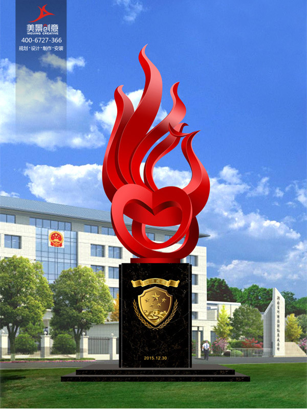 该作品由熊熊燃烧的“火凤凰”、全方位交织的“心”形及基座“盾牌”形等构成。表达“凤凰涅槃浴火重生”、“以爱攻毒”及以“忠诚尚法”为基础的深刻内涵。整体雕塑为红色,雕塑主体为抗腐蚀性能好的不锈钢材料,基座为黑色大理石嵌刻金色盾牌与豪壮标语,给人以阳光向上的振奋感,具强烈的视觉冲击力,更是对背景墙“崇法唯实尚爱笃行”核心价值观高度概括的视觉诠释。