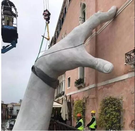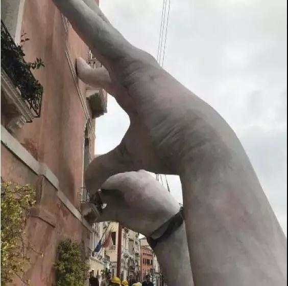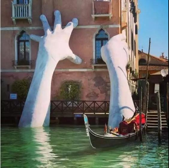 这一雕塑的名称为“支撑”,两只巨大的手型雕塑从威尼斯的一个水渠中“伸出”,好似扶住一家酒店的墙壁。据悉,这个雕塑是艺术家利用视觉艺术进行呐喊,警醒人们全球气候变暖问题。