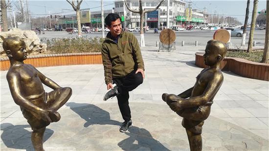 周口市建设路与八一路交叉口,是当地人人皆知的地标性区域“北花园”。昨日,大河报记者在北花园街心广场处看到,新设的4组铜人雕塑引来不少市民围观。这些雕塑中的人物造型以清朝、民国的复古 风格为主,年代感很强,令人似乎穿越到陈旧的城市街头,再现那个时期的贩子人生。