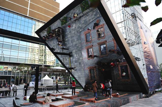 镜中飞人—这件能够参加的艺术品,于2013年11月19日在上海静安嘉里中心完工,由闻名阿根廷设备艺术家Leandro Erlich规划而成,变成了人人都能够玩特技的奇特之地。透过上海石库门,使用镜子的反射,使参观者走入设备进行空间互动,再由大斜向玻璃影子,进入设备的人会发现自己于石库门飞檐走壁。