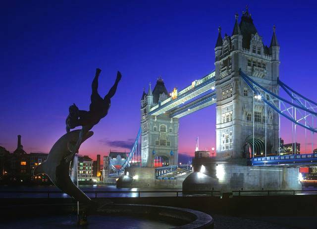 海豚与少女 在泰晤士河的北岸,伦敦塔桥周围,有一个英国后现代艺术家David Wynne1973年竣工的应战平衡感创作——海豚与少女的雕像。当夕阳西下,不少旅行者喜爱在这里留下浪漫的合影,也有许多画家沉迷于这调和又令人心跳的视觉冲击。