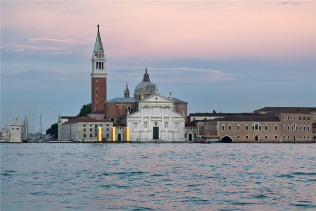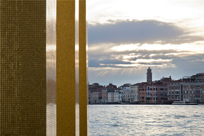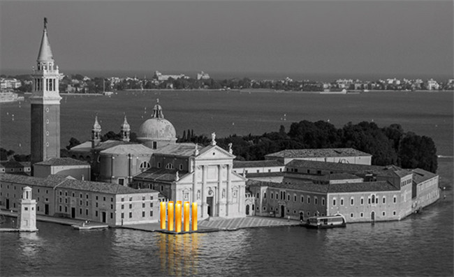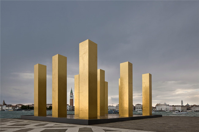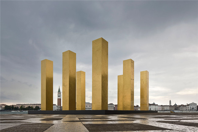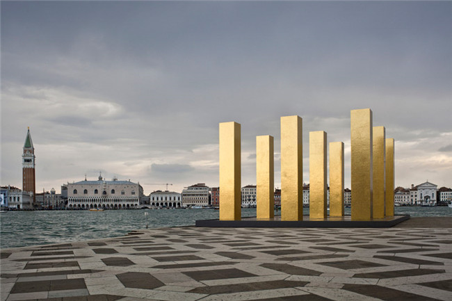 从威尼斯的地标圣马可广场一眼望去,便可看见超越大运河的“the sky over nine columns”,它是Heinz Mack的巨作。定位在威尼斯-伊索拉圣乔治.马焦雷教堂,装置有9个相同的柱体结构,每个到达7米的高度,被金色镶嵌的马赛克包裹, 参照了当地的工艺和威尼斯的东西方前期文化传统。而站立的柱子则作为人类直立的一种体现,以及标志着修建史上最早的元素,由此形成了天地之间直接的联系。