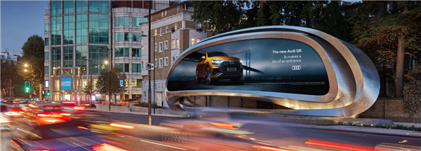 这是一个具有“里程碑”含义的广告结构,它融合了公众移速、现代设计和数字媒体。
