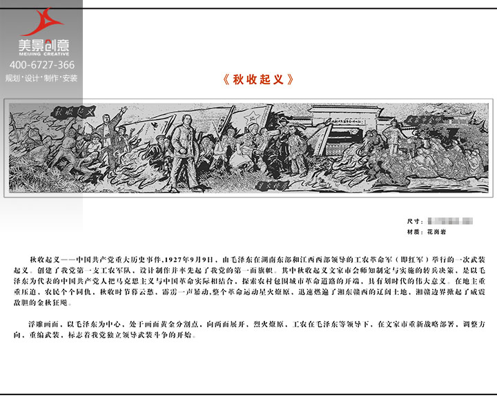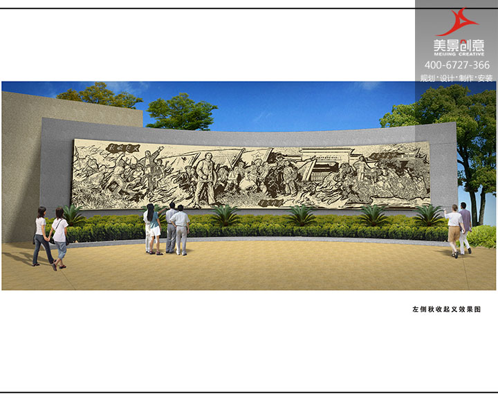 株洲县革命烈士纪念碑广场系列雕塑高3.6米,总长32.34米。美景创意依托历史事件,以“红色渌口”、“驰骋沙场”、“万民敬仰”三大篇章为创作轴线。“红色渌口”篇章主要展现株洲县在毛泽带领下农民如火如荼的进行革命…