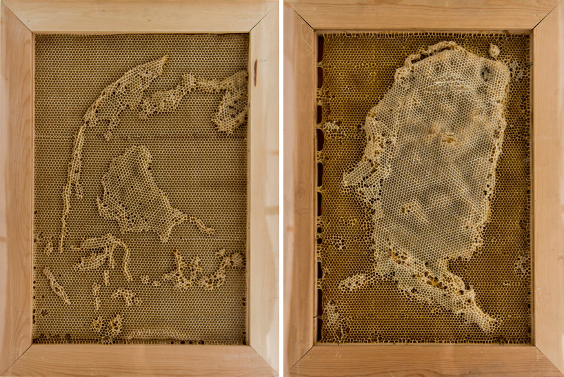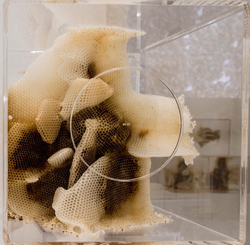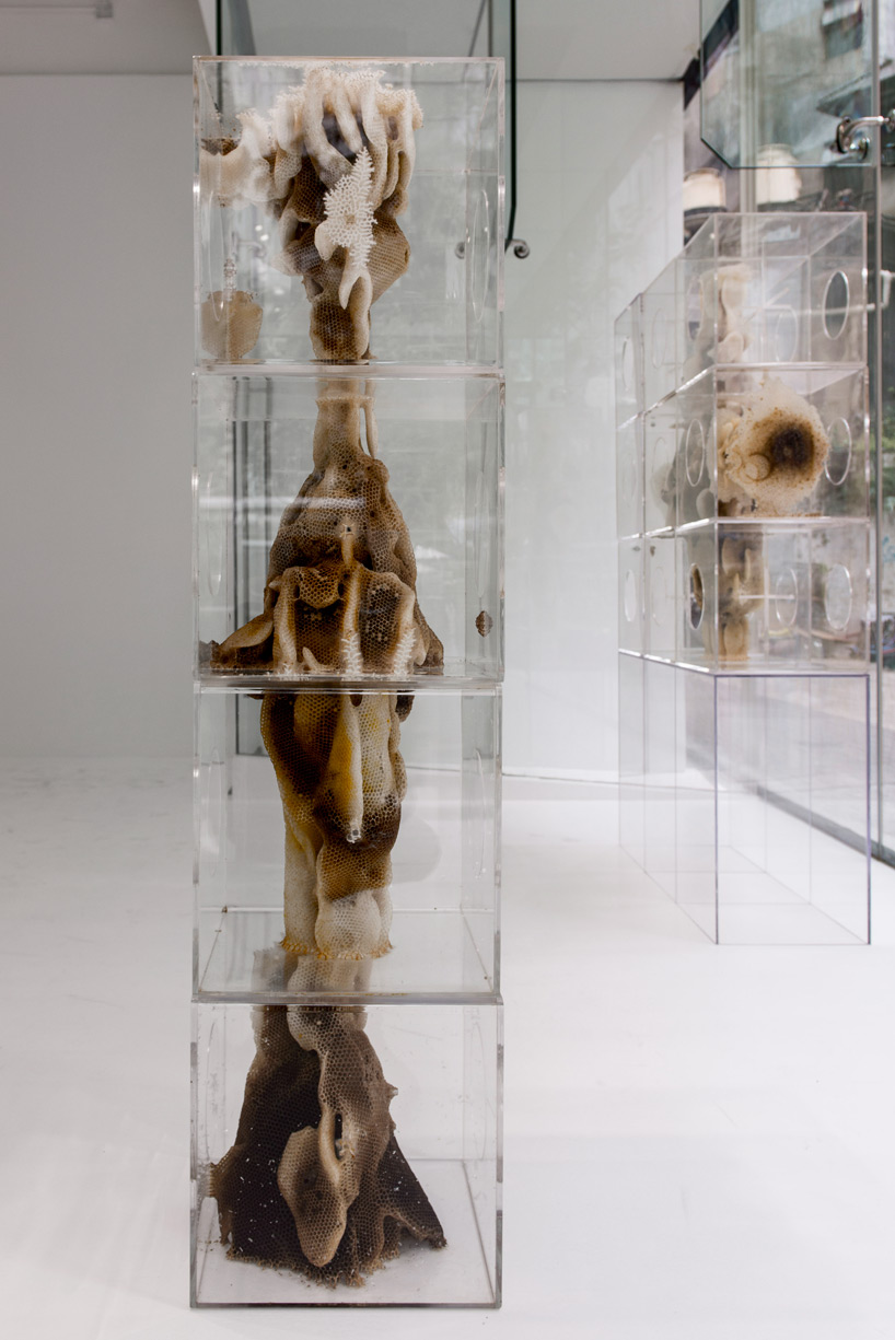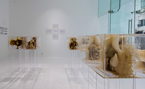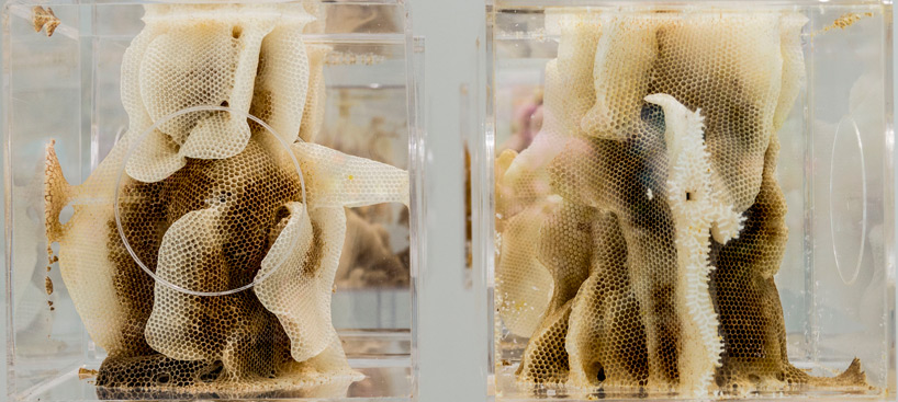 香港著名的林明珠画廊进驻了一批“奇怪”的雕塑,一眼看不出任何形态的作品让人有点摸不着头脑,仔细看才知道这些被密封在玻璃箱子里的奇怪雕塑都是用蜂蜡制造而成的,这些作品的作者就是来自北京的艺术家任日。无论是作为一个艺术家还是一个养蜂人,任日都很好的体现出了他的职业素养,他通过操控蜜蜂的运动,让蜜蜂自行完成并实现了他的混合雕塑,他将这一系列作品命名为“yuansu”(元素),以此来探究几何学的起源。