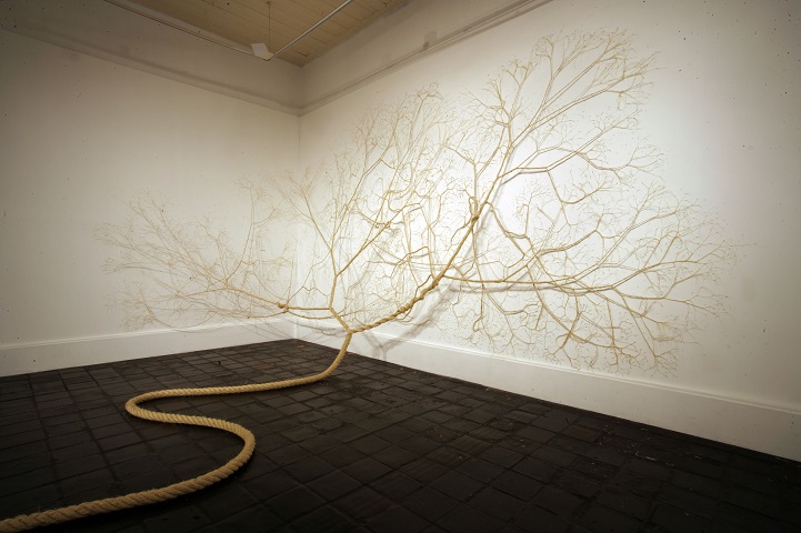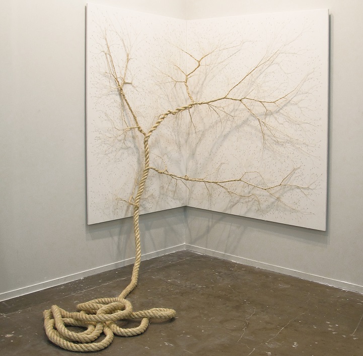 Mello + Landini是巴西的艺术家Janiana Mello 和Daniel Landini之间的合作,他们共同创造了一个持续系列的装置,称为Ciclotrama。这是由相互交织的多股绳索碾成的树的有机形装,多股麻绳可以形成一根枝干,也可以将其分裂成细小的股用作粗枝和细枝,承担起独立的角色。Ciclotramas这个作品细腻而有力的精致景象说明了时间的流逝和轮回,仿佛告诉人们,从大自然拿来的东西,早晚要还给自然。