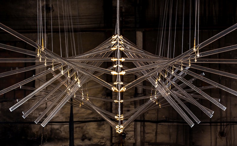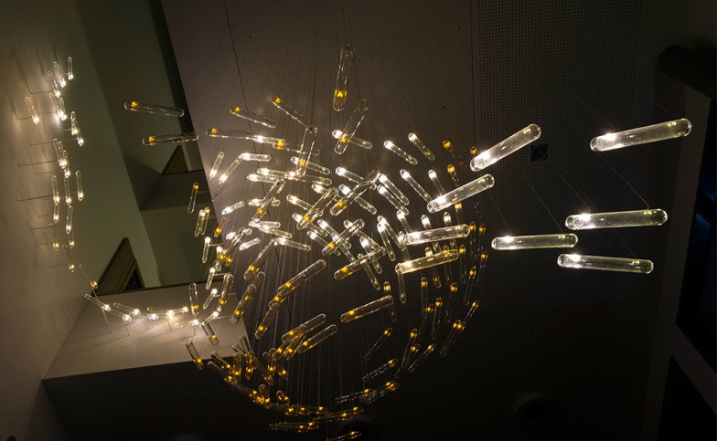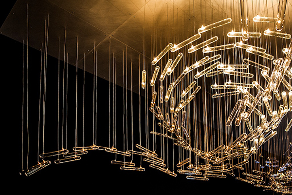 2015年威尼斯双年展上,作为Glasstress 2015 Gotika群展的一部分,Studio Drift(漂移工作室)带来了他们的最新动力装置作品“In 20 Steps”。这是一个用玻璃管,青铜,电子和电线组合而成的作品,40个精致的玻璃管组成一对巨大抽象的翅膀,在电脑编程控制之下捕捉每一个飞行的动作瞬间,而此作品正是为了纪念人们对飞行的渴望,征服大自然的欲望以及对科学的坚持。Studio Drift成立于2006年,由埃因霍温设计学院的两名优秀毕业生Ralph Nauta和 Lonneke Gordijn所创办,他们的理念是创建对立面之间的对话,自然与科技,知识与直觉等看似矛盾性质的两方面相融合,让人们达到一种无意识的感知。他们总是立足于从大自然中汲取灵感,通过科学的创新技术进行创造,在这里,光是一个关键因素,因为有了光,所以他们的作品才有了灵魂。