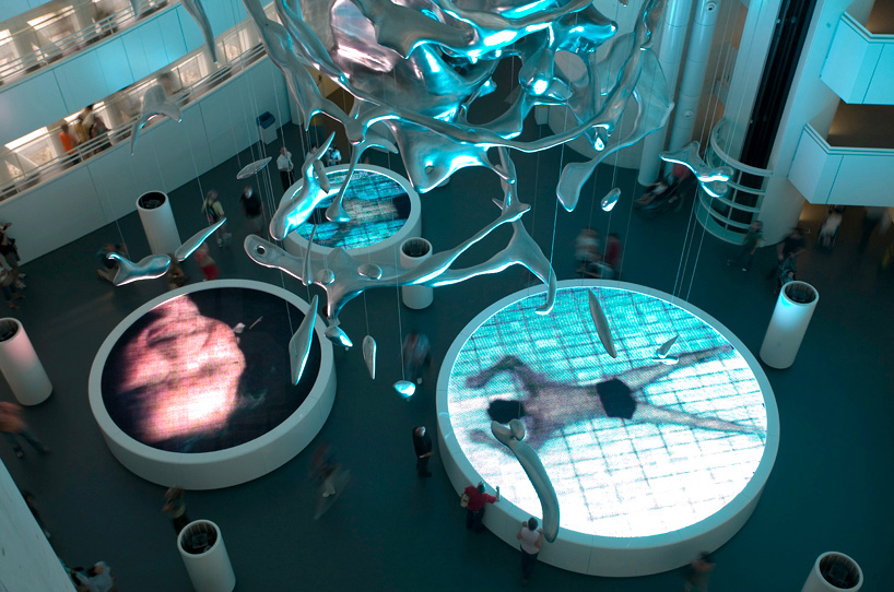在创作作品《飞溅》的过程中, Program Collective 设计团队的艺术家们遇到了一系列的高难度挑战。 这些挑战出现在各种创意性融合入形式的设计过程中,包括软件和结构工程的融合,机器建造和手工制作的融合,3D雕塑和实时媒体的融合,以及定位设计与社会变革经验的融合。 作品结合了听觉效果与视觉效果,再加上有40多米高典雅展厅的烘托,作品的展览达到了最佳效果。作品“飞溅”拥有视觉效果强烈的双螺旋上升结构,它庞大的规模和复杂的结构只有观察者不断移动脚下的步伐,观察到作品的各个视角才能够充分理解。当参观者爬到展厅的高层位置附身观察整件作品时,便能感受到作品的实时动态特征受到周围影音设备的加强。观察者通过不断移动、感受和讨论来理解作品每个组件之间的关系。
