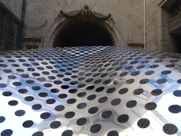 作品主要是由两块穿孔的铝板构成,板材平均厚度约2毫米,利用铝材的软度进行有节奏的弯曲,形成了一片浮在地面之上的“金属云”,与周围的建筑形成了鲜明的对比。FAKT称他们的装置为“一个进步的空间和结构实验”,并使用艺术挖掘铝的造型能力的可塑性,金属塑造的自然形态作品也着实给人们带来了一种独特的视觉感受。