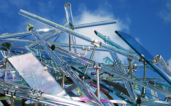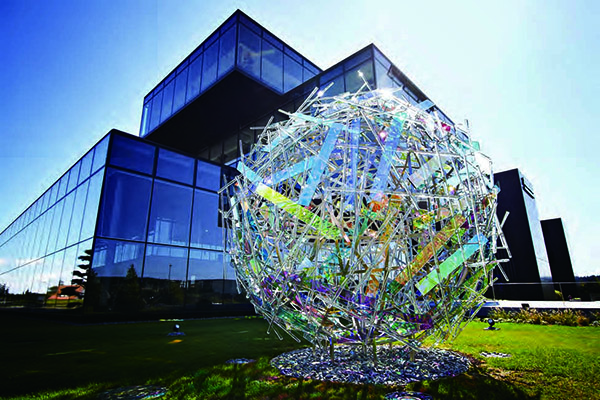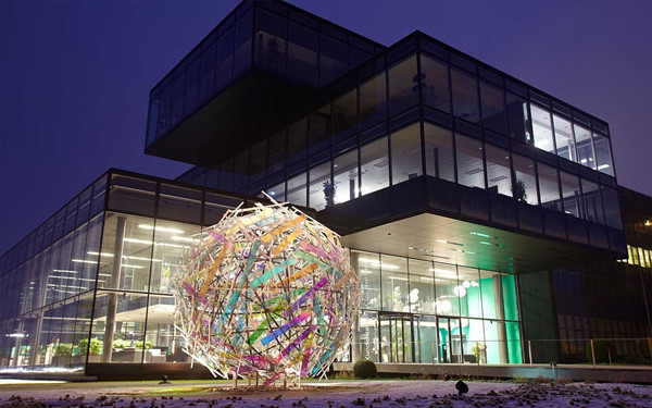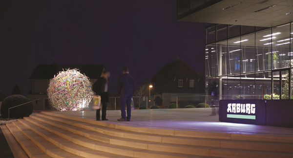 这样一个纯商业化的企业也不甘于只做买卖,他委托著名的公共艺术家Gordon Huether为其打造了一个巨大的球形装置雕塑,在ARBURG的建筑大楼外熠熠生辉。该作品是用不锈钢为低,同时在不规则的网状不锈钢球体上安装了片状的艺术有机塑料和耐热的塑料分色片,在阳光下散发着夺目的光彩,同时也体现着ARBURG公司的实力和全球影响力。