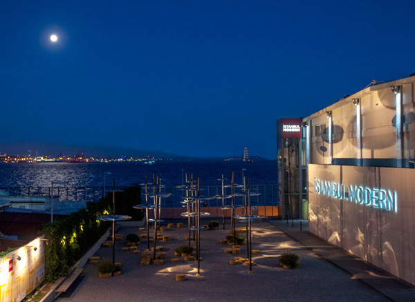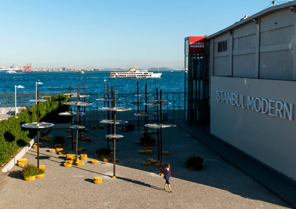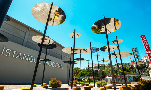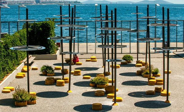伊斯坦布尔现代博物馆门前,由当地建筑事务所SO? architecture安装了大型的装置雕塑“停在天空的斑点”。一系列像磁盘一样的不锈钢镜悬置在空中,反映着下方的景色,白天充当着树的角色,迎着风在博斯普鲁斯海峡的岸边不停地摇曳,婆娑的影子洒落在地上,呈现一片假日海滩的景象,也吸收着海峡中河流的动力创造资源。夜间因为阴影和钢镜的反射会呈现出一种俏皮的场景色调,为城市输送着因动能而创造的资源,也体现了这个城市中河流的重要性。