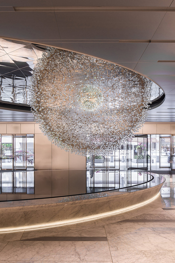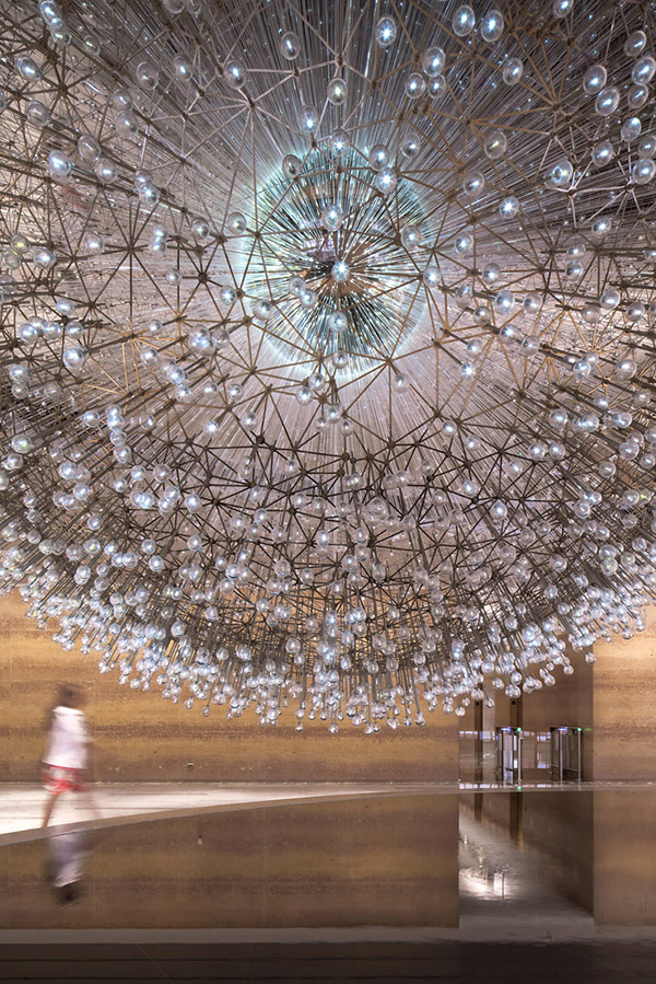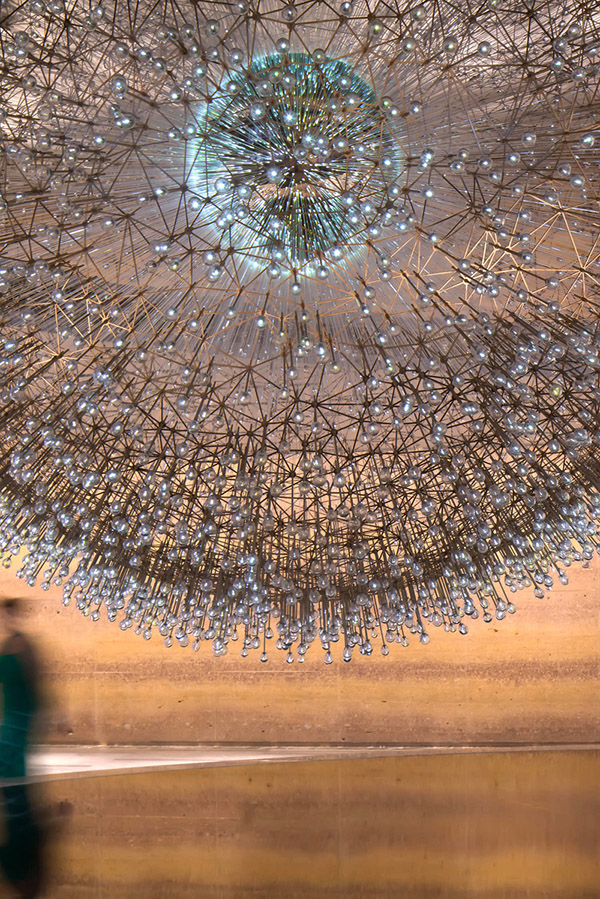 作为约翰汉考克中心(John Hancock Center)大堂翻新之后的标志性雕塑,“Lucent”着实吸引了人们的眼球,这个巨大的半透明玻璃雕塑是艺术家Wolfgang Buttress手工打造而成,远远看过去就像悬挂在大厅中的巨大蒲公英,而实际上,这个雕塑的灵感来自澳大利亚国立大学的天体物理学家Daniel Bayliss博士进行的天体映射研究,意义也值得深究。但仅从作品来看,“Lucent”是一个直径4米的球体,精致的不锈钢丝缠绕成星体运行图,上面还安装有3000多个手工吹制的玻璃球,在灯光的投射下更加熠熠生辉。