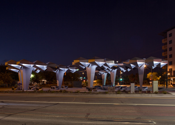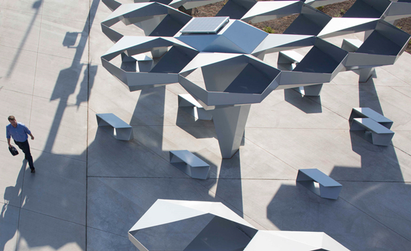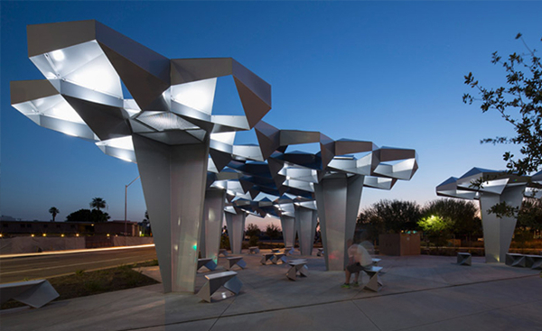 Yoon工作室的创始人Eric 说:“地面上的阴影就像画一样,随着一天中太阳不同位置的变化,他们在地上呈现的光影也随时在变化,而且,作品具有分散性质,充分保持了空气的流通。”几何形集群的“树冠”之上安装有太阳能光伏板,白天集中能量,到了晚上它可以让安装在结构上的LED灯光全部点亮,在夜间发出美丽的光,照亮整片“森林”。毫无疑问,这片区域将成为凤凰城的中心街景吸引更多的人前来观赏。