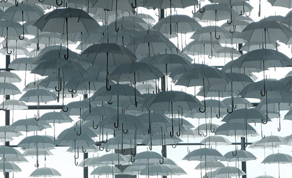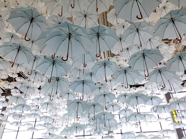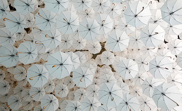 大数量的积聚总会造成极其壮观的视觉感受,环境艺术家Kaisa Berry和设计工作室BOTH的创意总监Timo Berry,在2015年Habitare设计展(Habitare Design Fair)中,共同脑力激荡出的雕塑装置艺术,将1100只雨伞高挂在大厅上,看起来就好像一朵朵白云飘浮在头上,参杂着篮色和紫色的光影,让人沉浸在这一片雨伞天空下,让人忍不住抬头多看几眼,尽情享受这片白色森林。