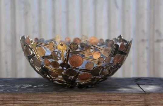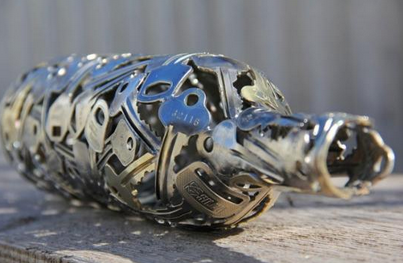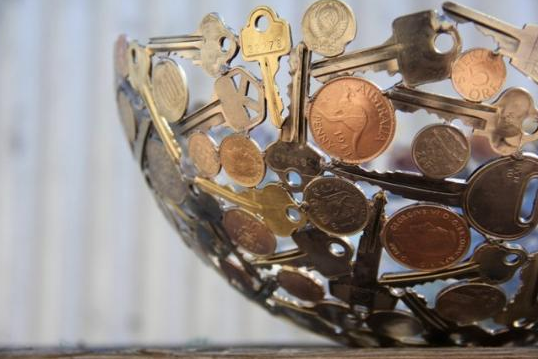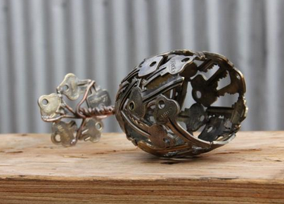 一次日常清理中,澳大利亚艺术家 Michael (又叫Moerkey)发现了以前装修时剩下的旧铜管,他将它们剪成了环形,并用来制作球形。一开始略嫌粗糙 ,但在不断的摸索中 ,他的技艺越来越好,所以后来艺术家就开始囤积和搜寻周围所有人家不再需要的旧钥匙和铜线,并用来创作瓶子、灯罩、酒杯等精美雕塑。