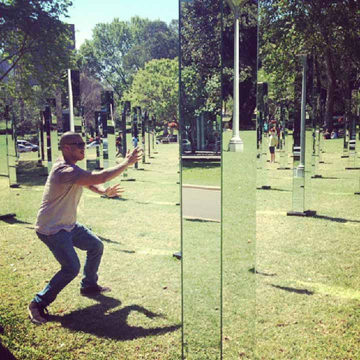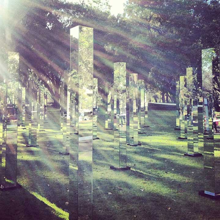 新西兰的建筑师团队Out of the Dark 将一组八十一根四方镜面立柱,也就是423面镜子,装置在悉尼海德公园的开阔绿地上,作为一座公共艺术项目,名为“Field” ,是艺术家们对视觉本质的一种思考。参观者倘徉其中,也会对真实与幻象产生思索。