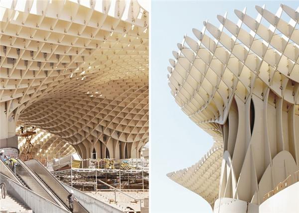 空间由有组织性的编织密集的构造和波纹状面板构成,并且和周围的中世纪环境形成明显的对比。“都市阳伞”(metropol parasol)被认为是这个时代规模最大且最具创新的木结构之一,它由一个考古遗迹发展成一个当代的里程碑标志,确切的表现了传统和现代主义之集成。