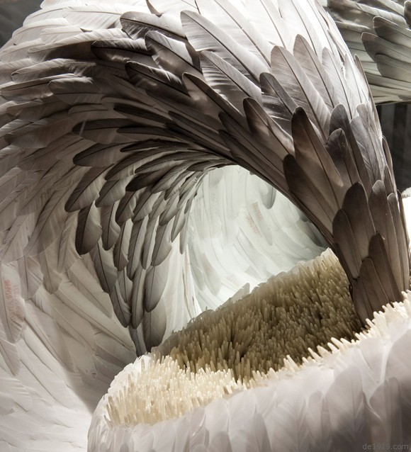 伦敦雕塑家kate通过邮件向农民收集了鸡鸭鹅、鸽子、喜鹊、鹬等各种鸟类的羽毛,并通过反复的整理、拍照、再整理创作了这系列流动的羽毛雕塑,分别是”渴望”、“压抑”、“诱惑”、“欺骗”、“幻想”这5个主题,不知道大家能否看懂这些雕塑?