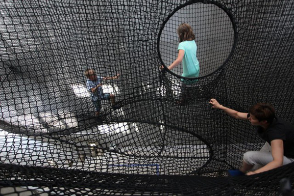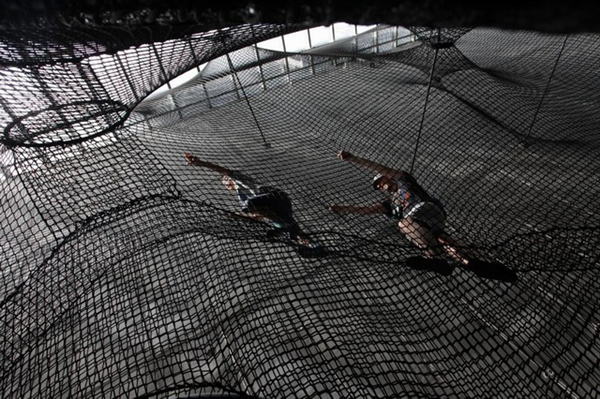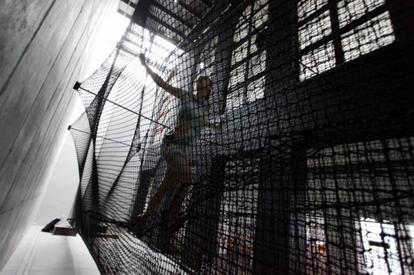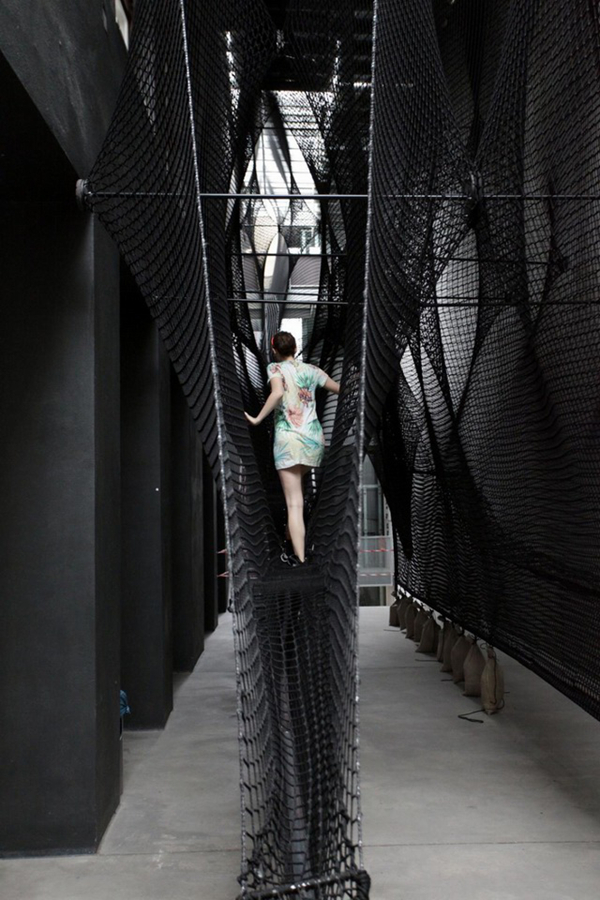 当游客沿着如同陡峭的峡谷向上攀爬时,编织网也会随着游客的变化而变化并轻轻晃动着。