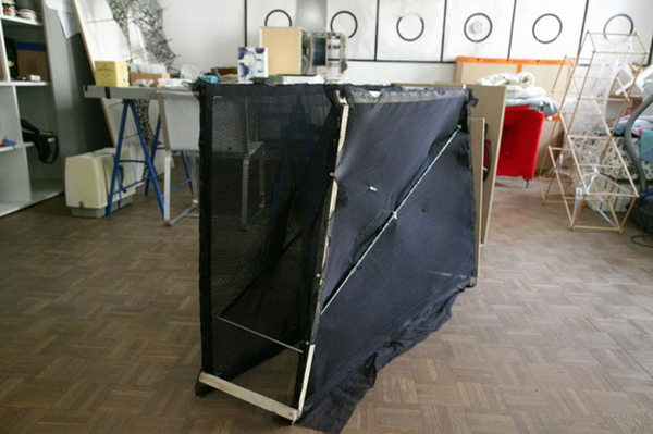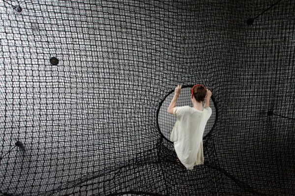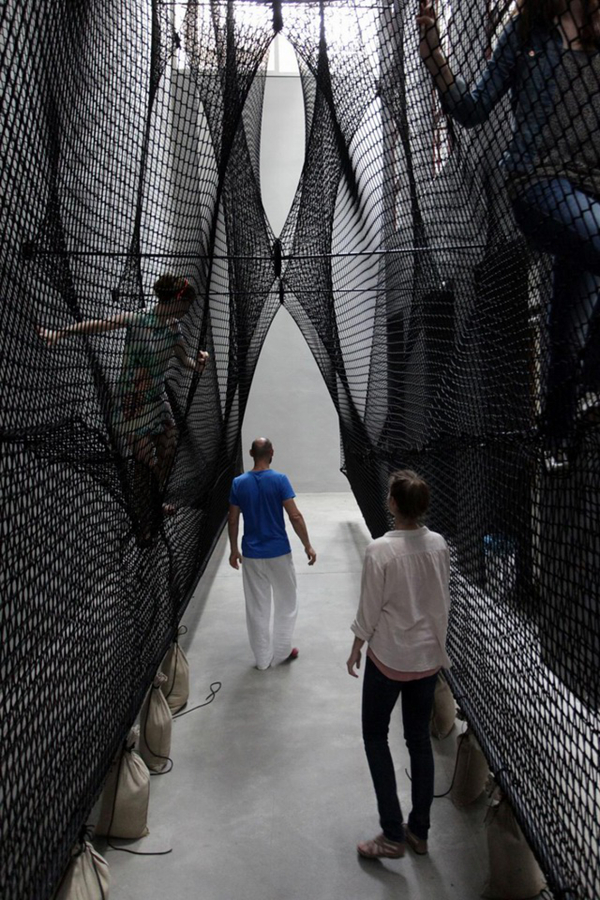 整件作品由黑色的编织网编织而成,在这个画廊里发展成为一个具有特色的移动空间。垂直分布的结构,看起来像一条狭窄的峡谷般的通道。编织网悬挂在天花板上,由地面上一定重量的沙袋连接起来形成的拉伸来保持稳定。Numen/For Use 设计团队曾使用了大量的编织网,但总是在一个水平面上。这次的设计是一种新型的拉紧方式。