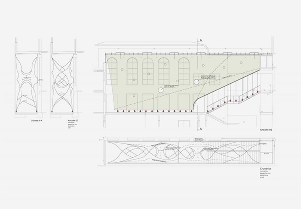 设计师表示,当你让人们“飞行”在8米的高空中时,你首先考虑的是必须去确保他的安全。因此,设计师设计这个编织楼梯时同样运用到了楼梯的基本原则。并在此之前构建了一个5米长的,1:4的比例的模型并不断地进行实验。